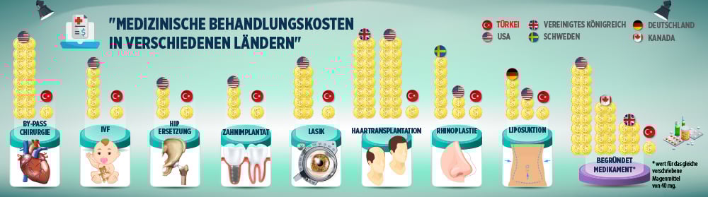 • Während die Kosten für die medizinische Bypass-Operation in den USA zwischen 94.000 und 210.000 USD liegen, liegen sie in der Türkei bei 12.000 USD. Die Angioplastie liegt in den USA zwischen 44.000 und 98.000 USD, eine ähnliche Aktivität kostet in der Türkei 3.500 USD.