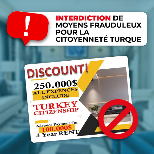 Si vous souhaitez demander la citoyenneté turque, le gouvernement turc exige 250.000 $ comme investissement. Au lieu de payer ce montant, certaines entreprises de construction vendent des immobiliers moins chers que la limite d'investissement pour la citoyenneté, modifiant illégalement le rapport d'évaluation de l'immobilier du demandeur pour le montant requis. Ils donnent une garantie de récupération ou de revente avec une augmentation de prix de 30 à 35% après 3 ans de période d'attente pour l'immobilier que vous avez utilisé pour la citoyenneté.