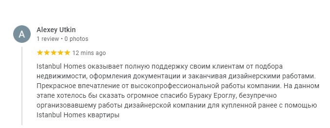 Istanbul Homes оказывает полную поддержку своим клиентам от подбора недвижимости, оформления документации и заканчивая дизайнерскими работами. Прекрасное впечатление от высокопрофессиональной работы компании. На данном этапе хотелось бы сказать огромное спасибо Бураку Ероглу, безупречно организовавшему работы дизайнерской компании для купленной ранее с помощью Istanbul Homes квартиры.